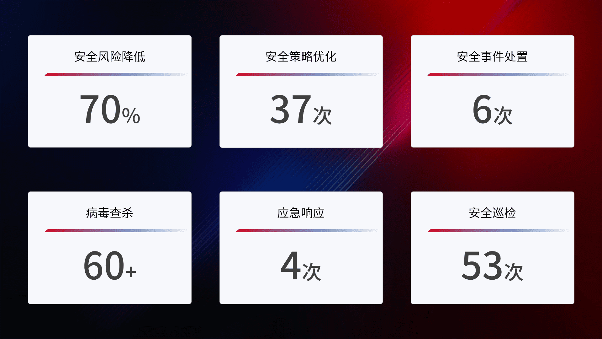 提供全面的安全事件报告体系,,,,包括处置报告、、、周报、、、季度和年度总结,,结合持续监控,,帮助客户深入了解网络安全状况。。。